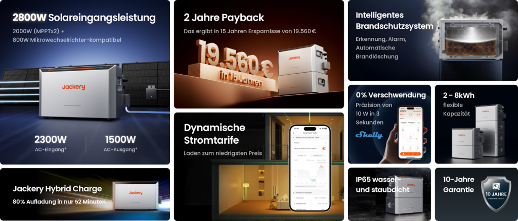 Wenn Sie bereit sind, in ein Balkonkraftwerk zu investieren, bietet Jackery eine der fortschrittlichsten und benutzerfreundlichsten Optionen auf dem Markt. Das Unternehmen ist weltweit für seine hochwertigen tragbaren Stromversorgungslösungen bekannt und hat sich insbesondere in den Bereichen Solarenergie und mobile Batteriespeicher einen soliden Ruf für Zuverlässigkeit, Innovation und Leistung erworben.